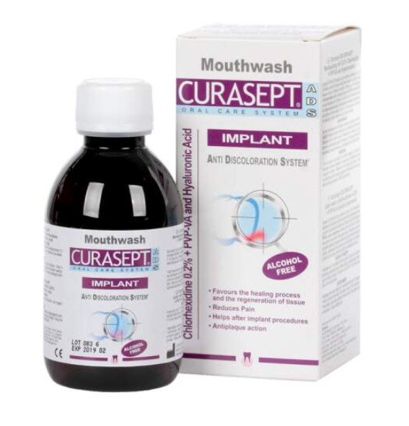 Popis: Ústna voda s 0,20 % chlórhexidínom sa odporúča pri zavádzaní implantátov, po komplikovanej extrakcii zuba či iných chirurgických zákrokoch v ústach, pri zápale ďasien a parodontu. Ak hľadáte účinnú ústnu vodu proti bakteriálnemu povlaku s ochranou proti pigmentácii, vyskúšajte Curasept ADS Implant. Obsahuje kopolymér PVP-VA a kyselinu hyalurónovú. Kombinácia týchto dvoch látok tvorí na sliznici ďasien ochranný film a pomáha v priebehu regenerácie tkaniva.