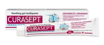 Popis: Zubná pasta s 0,20 % chlórhexidínom a chlórbutanolom, na upokojenie bolesti po stomatologických zákrokoch a poraneniach v ústnej dutine. Upokojujúca gélová pasta Curasept ADS Soothing zmierňuje bolesť po stomatologickom zákroku a pomáha proti usadzovaniu zubného povlaku vďaka obsahu chlórhexidínu.